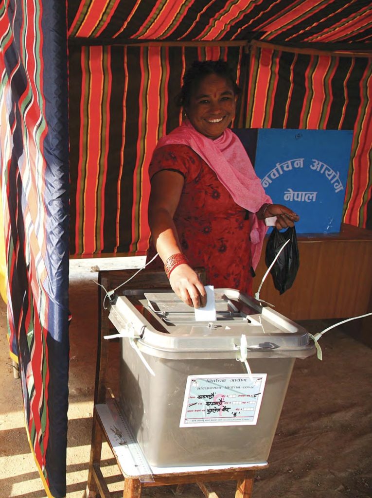 २०६४ मा सम्पन्न पहिलो संविधान सभा निर्वाचनमा मतदान गर्दै काठमाडौंकी एक मतदाता।