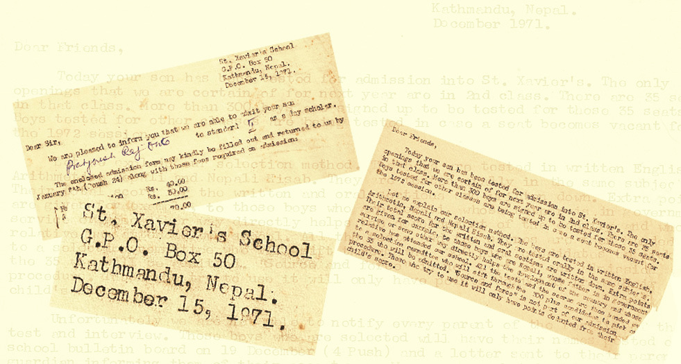 Before we returned home, my father, Tirtha Raj Onta, and parents/guardians of all test-takers were given a printed letter signed by Fr Cachat (see Figure 1). It mentioned that more than 300 boys had signed up to take the admission test for Class II but the school could accommodate only 35 students. The letter went on to explain the selection method: