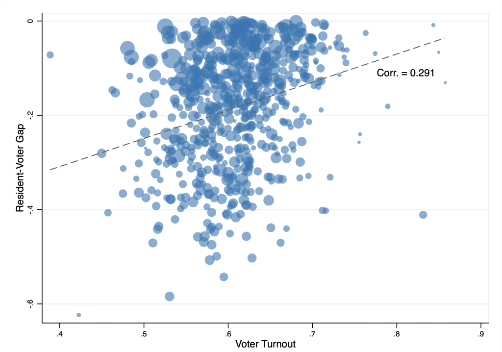 Figure 3: Correlation between net migration and resident-voter mismatch across municipalities