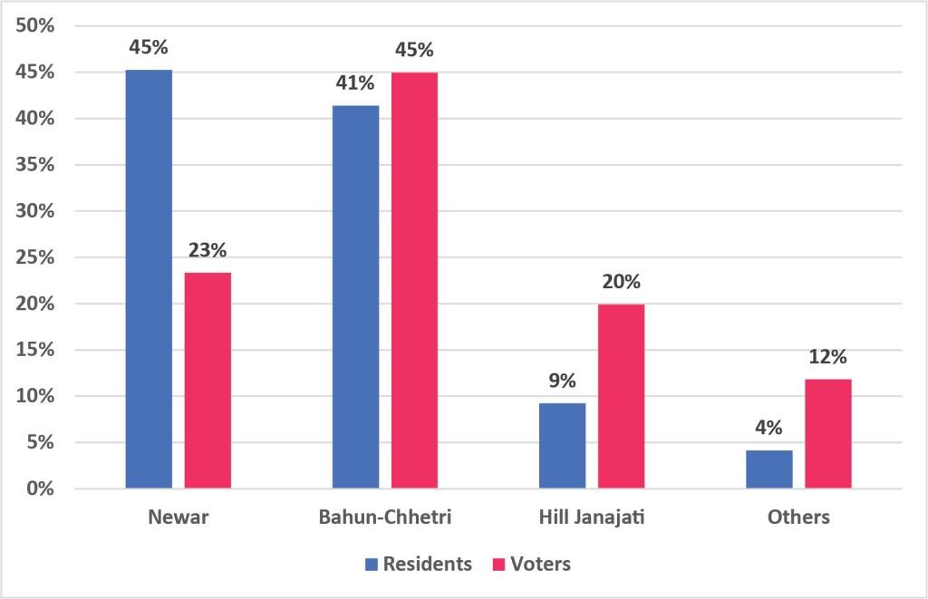 The KMC voter roll diverges from the census in several key dimensions, reflecting who has settled in the city recently versus who has been registered there longest. The electorate skews slightly female and significantly older—46 per cent of residents fall in the 45–65 age band, compared to 59 per cent of the electorate (Figure 4). Ethnically, Newars—the indigenous inhabitants of the Kathmandu Valley—are overrepresented relative to their census share (23 per cent of residents versus 45 per cent of the electorate). Non-Newar Hill Janajati groups, who are largely recent migrants into the valley, are severely underrepresented (20 per cent of residents versus 9 per cent of the electorate).