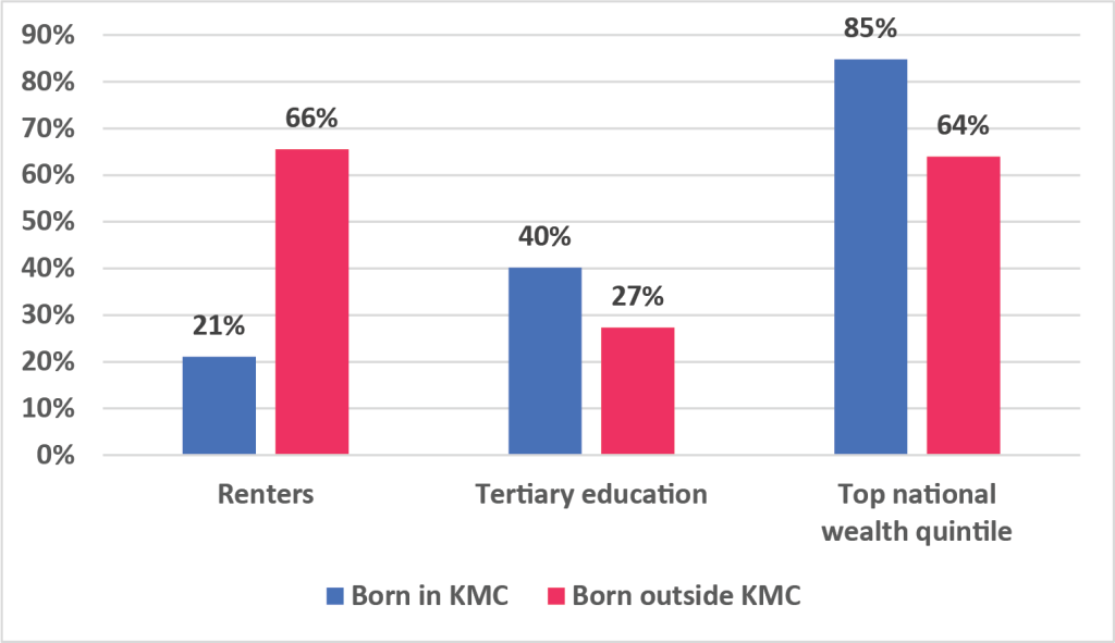 These demographic differences point to a potentially significant divergence in policy preferences. Census data show that KMC residents born outside KMC (Figure 5)—a proxy for the spatially disenfranchised—are significantly more likely to be renters (66 per cent versus 21 per cent), less likely to have completed tertiary education (27 per cent versus 40 per cent), and less likely to be in the top national wealth quintile (64 per cent versus 85 per cent). The spatially disenfranchised—more economically precarious and more likely to be renters—remain largely invisible to the electoral process that governs their daily lives.