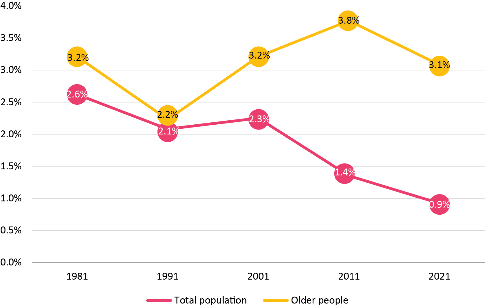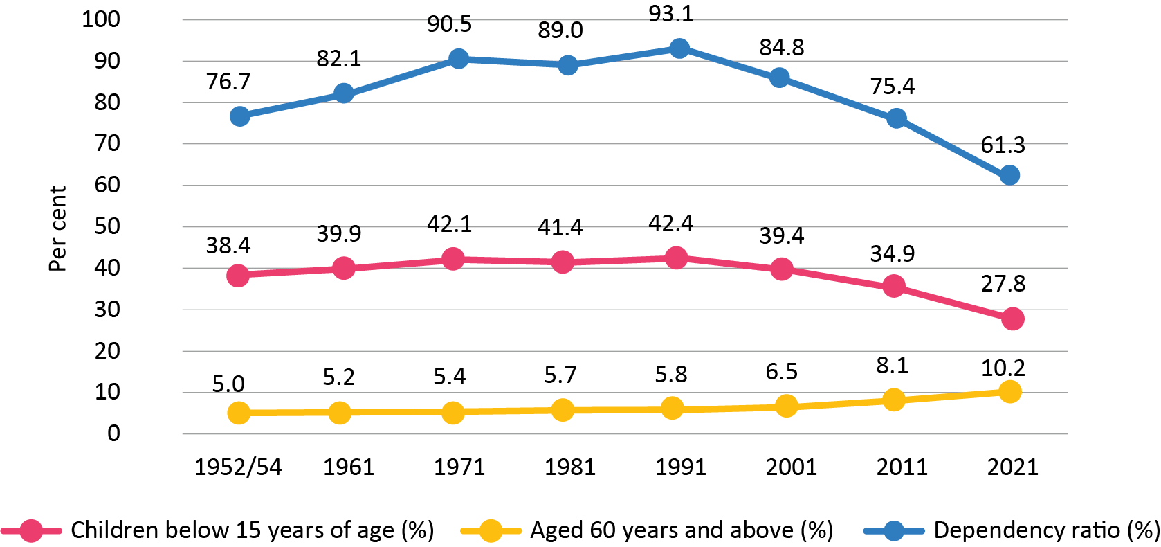 While there has been a gradual decline in the overall dependency ratio over the last four censuses, the old-age dependency ratio (ratio of individuals aged 60+ to every 100 people of working age) has been rising continuously since 1981, reaching 16.5 in 2021, an increase of 52.8 per cent. There is no direct relation between household size and old-age dependency ratio but a rapid increase in the dependency ratio has implications on family resources where the number of family members likely to support older people continues to decrease.