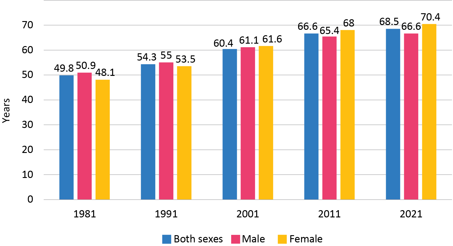 It was 50 years for both sexes in 1981, reaching 54 years in 1991. Both the censuses showed higher life expectancy for males than for females. Census 2001 showed an increase in life expectancy by six years, reaching 60.4 years, a significant increase in a decade. Also, for the first time in the census history of Nepal it showed female life expectancy higher than that of males. Life expectancy continued to increase in the same pattern in the succeeding years. Census 2011 showed an addition of 6.2 year in the total life expectancy and onwards the pace of increase slowed down relatively. By the 2021 census, the average life expectancy for both sexes had reached 68.5 years while the difference between male and female life expectancy was 3.8 years with female life expectancy of 70.4 years and that of males, 66.6 years.