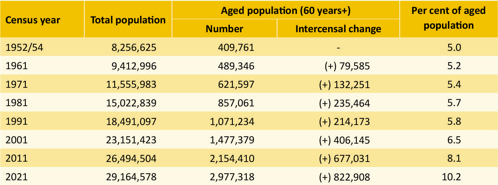 A comparison of the growth rate of the total population and the elderly shows the 2001 census to be a watershed because there has been a sharp decline in the growth rate of the total population thereafter (Figure 1). A factor to also consider in this regard is that in 2011 and 2021, 1.9 million and 2.2 million, respectively, were recorded as absentees outside the country.