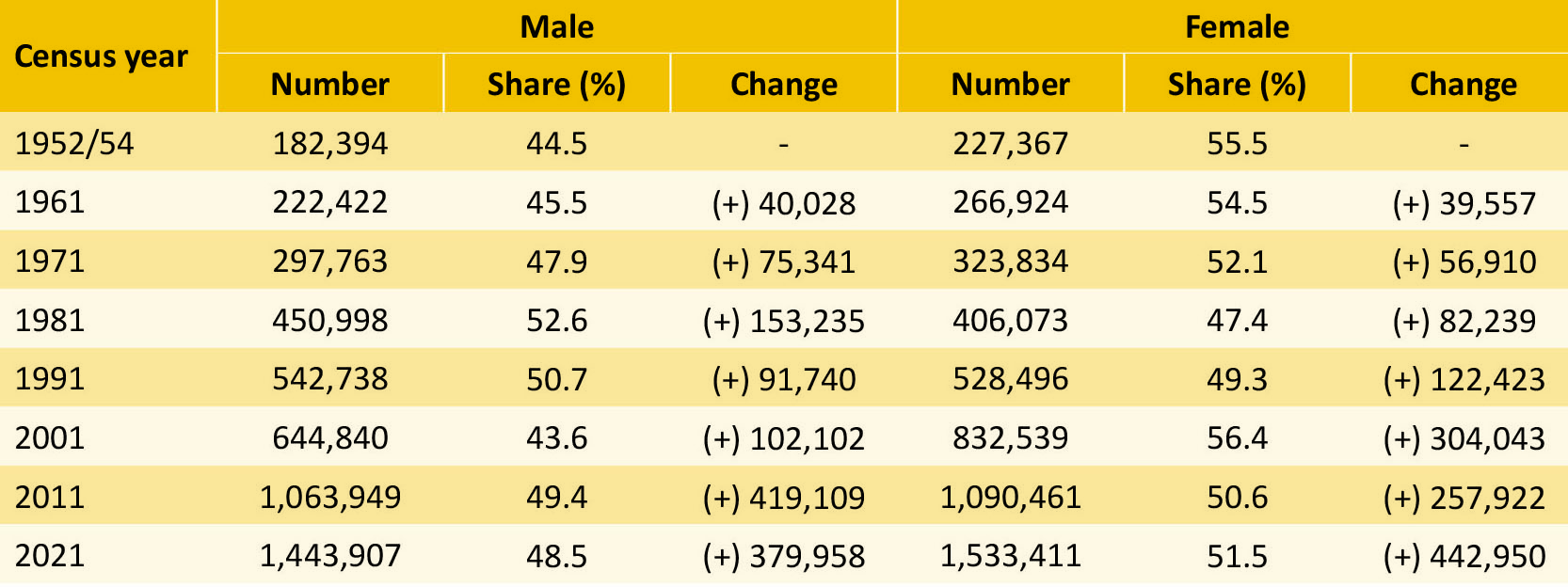 Over the past seven decades, the population of aged males increased by nearly eight times while the corresponding figure for females was around seven-fold, a seeming discrepancy resulting largely from the higher base population of females in 1952/54. The total population size of elderly females was consistently higher than that of males in the last three census results, with an average increase of elderly males by 300,390 and of females by 334,972 persons in each intercensal decade.
